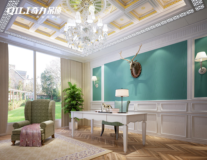 白色木紋墻裙與藍綠色墻面遙相呼應,難得一見的清麗脫俗,陽光透過紗簾慵懶的投射在地毯上,拉出長長的影子,一杯咖啡、一本好書,就著一米陽光,盡情享受這份春色吧!